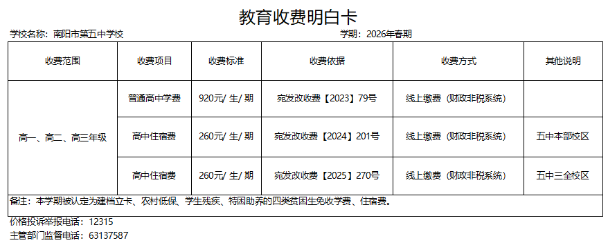 南阳市五中2026年春期收费明细卡公示